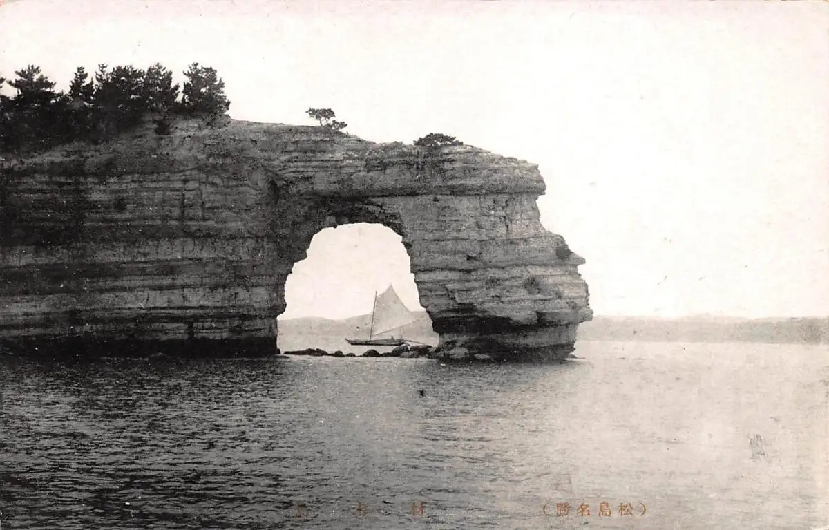 Japan Blick durch Felsentor an Küste auf Dschunke ngl 160.704