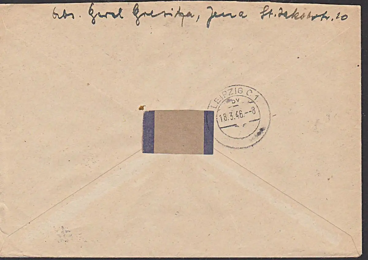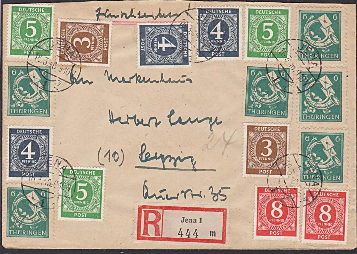 Jena SBZ 95(6) 6 Pf R-Brief aus JENA in MiF mit Ziffern, dabei seltener Plattenfehler "Einfassungslinie oben gebrochen"