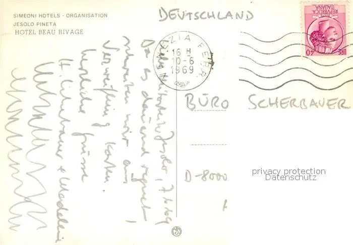 Jesolo_Pineta Hotel Beau Rivage Jesolo Pineta postalisch gelaufen 1969 Erhaltung siehe scans [LiesaD40] LiesID40