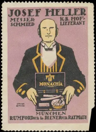 Messer, Rumfordstr. 1und Dienerstraße, Größe/Zustand: 6x5 , beschädigt, Original alte Reklamemarke die seinerzeit für die Werbung benutzt wurde