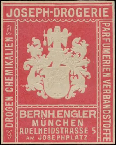 Drogen, Chemikalien, Parfümerien, Verbandstoffe, Adelheidstraße 5 am Josephplatz, Größe/Zustand: 5x4 , guter Zustand, Original alte Reklamemarke die seinerzeit für die Werbung benutzt wurde