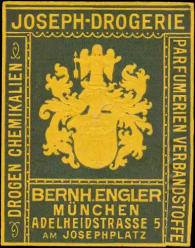Drogen, Chemikalien, Parfümerien, Verbandstoffe, Adelheidstraße 5 am Josephplatz, Größe/Zustand: 5x4 , beschädigt, Original alte Reklamemarke die seinerzeit für die Werbung benutzt wurde