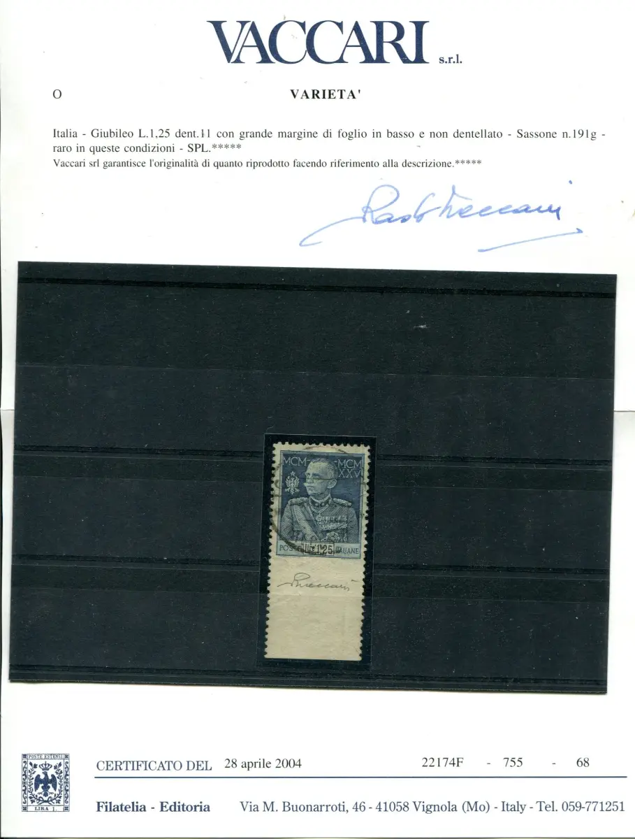 - Giubileo Lire 1,25 Nr. 191g schönes gebrauchtes Exemplar ungezähnt unten b. von f. integral - Selten - Zert. Vaccari - Kat. Euro 1.000 n. 626/A