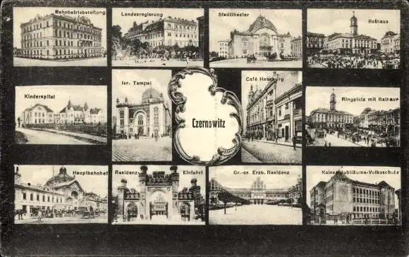 Judaika Ak Czernowitz Ukraine, Stadttheater, Rathaus, Ringplatz, Volksschule, Kinderspital, Synagoge