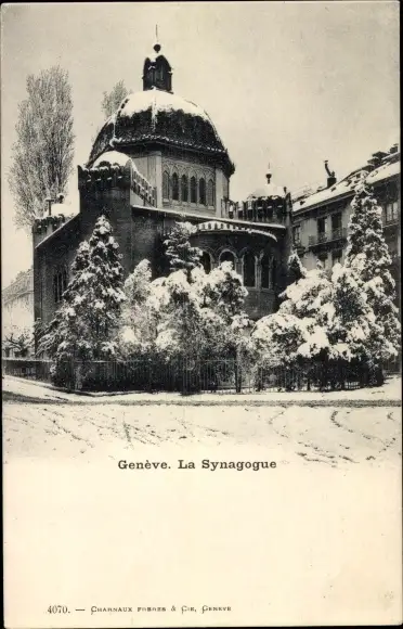 Judaika Ak Genève Genf Stadt, La Synagogue, Synagoge im Winter
