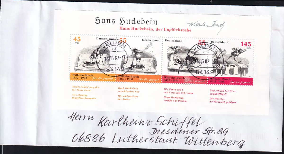 zwei sehr schöne Bahnpostbelege, einmal HUSUM-GARDING von 1916 - ohne Zugnummer aufgrund der Furcht vor feindlicher Spionage - und ERFURT-EISENACH von 1965. Vielen Dank, bin mit der Lieferung sehr zufrieden.