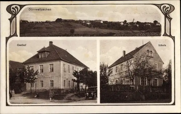 Jugendstil Ak Dürrweitzschen in Sachsen, Gasthof Möbius, Schule, Blick auf den Ort