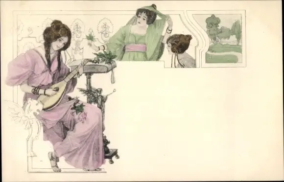 Jugendstil Ak Frauen in historischer Kleidung, Laute