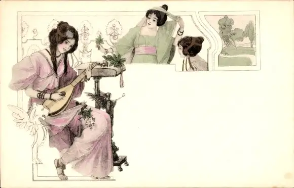Jugendstil Ak Frauen in historischer Kleidung, Laute