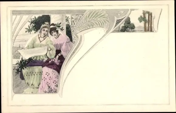 Jugendstil Ak Frauen in historischer Kleidung, Schriftrolle