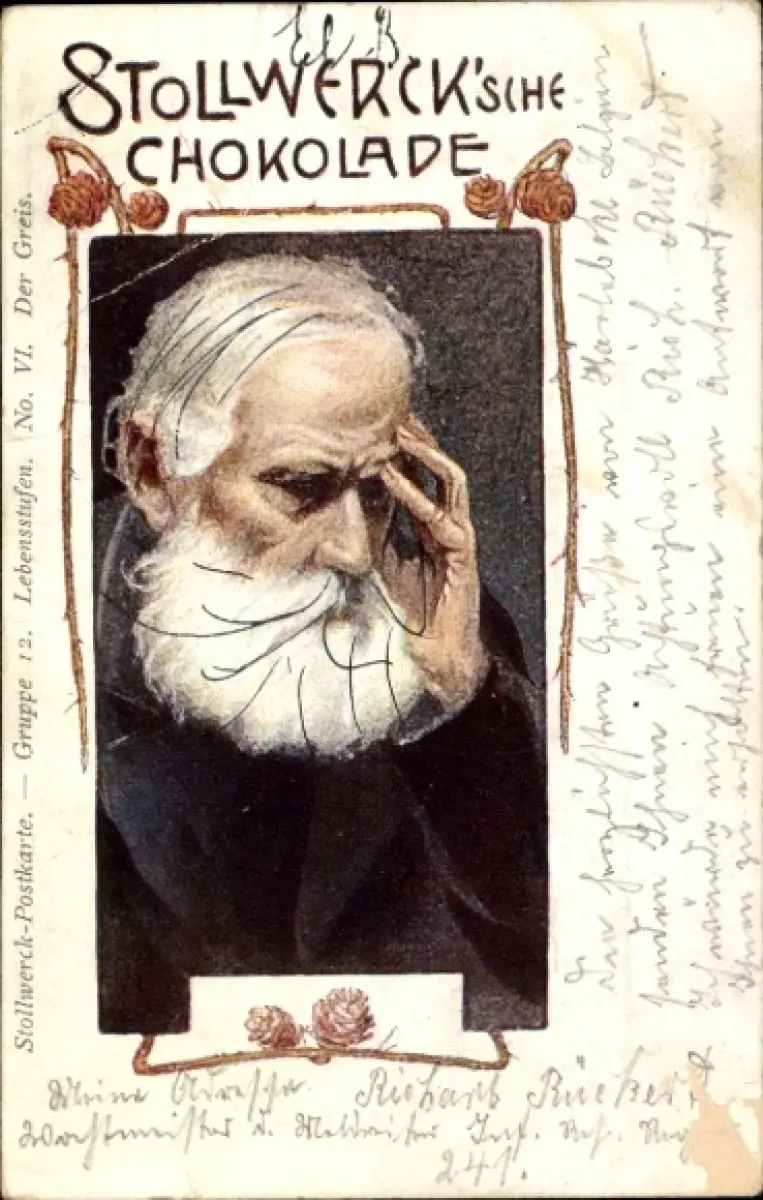 Jugendstil Ak Reklame, Stollwerck Gruppe 12, Lebensstufen No. VI, Der Greis