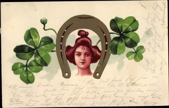 Jugendstil Litho Frauenportrait, Hufeisen, Kleeblätter