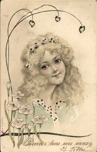 Jugendstil Litho Portrait von einem blonden Mädchen
