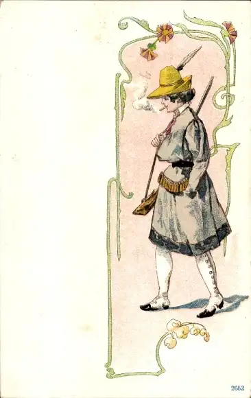 Jugendstil Litho Rauchende Frau mit Gewehr, Jägerin