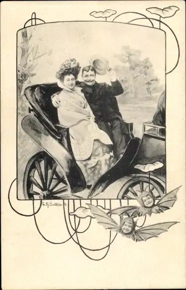 Jugendstil Passepartout Ak Liebespaar in der Kutsche