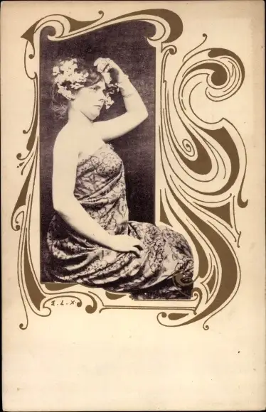 Jugendstil Passepartout Ak Portrait einer Frau mit Blumen im Haar