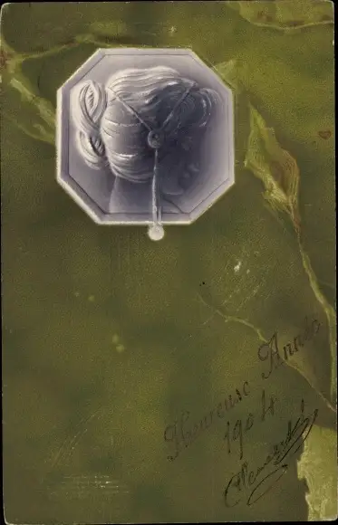 Jugendstil Präge Litho Glückwunsch Neujahr, Frauenportrait, Haarschmuck