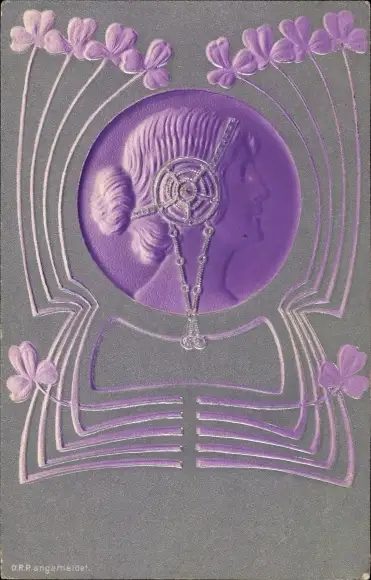 Jugendstil Präge Litho Portrait einer Frau mit Haarschmuck