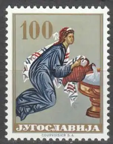 „Die Kunst in Jugoslawien durch die Jahrhunderte“ (I): Detail des Fresko „Die Geburt Christi“ (Kloster Dečani) (14. Jh.)