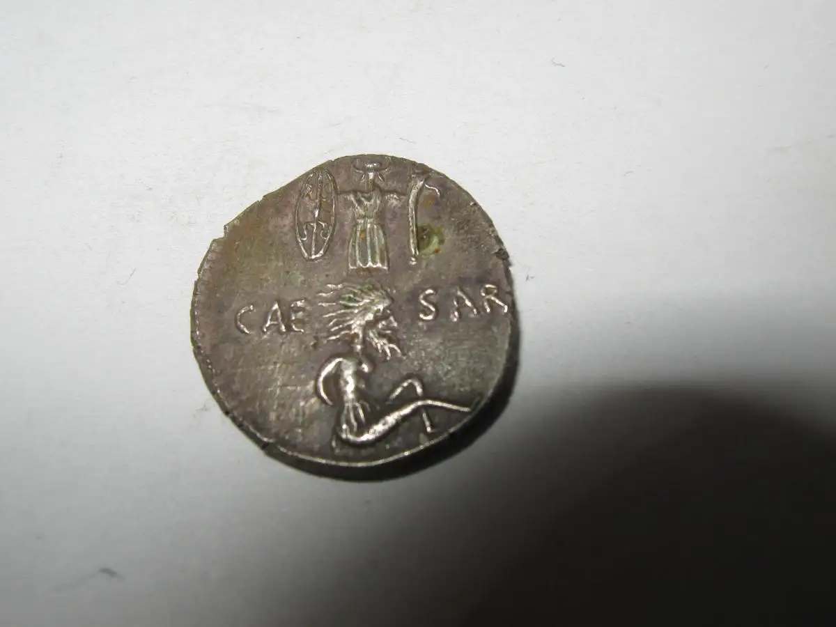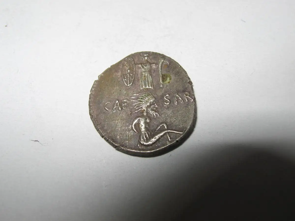 Um seine Macht nach seiner Rückkehr zu festigen, produzierte Caesar triumphale Münzen, um Nachrichten über seine militärischen Fähigkeiten zu verbreiten. Die Rückseite dieser Münze soll Vercingetorix selbst darstellen. Obwohl Crawford und Sear dieser Identifizierung skeptisch gegenüberstehen, wurde oft gesagt, dass die sorgfältig wiedergegebenen Details der Figur, von der markanten Braue und den eingefallenen Augen bis hin zum Drehmoment um seinen Hals, stark an ein individuelles Porträt erinnern. Dies ist ein frühes Beispiel dafür, was in der Münzprägung zu einer Tradition werden sollte, einen besiegten Gefangenen darzustellen, der auf dem Boden sitzt und sich der Macht der Römer unterwirft.