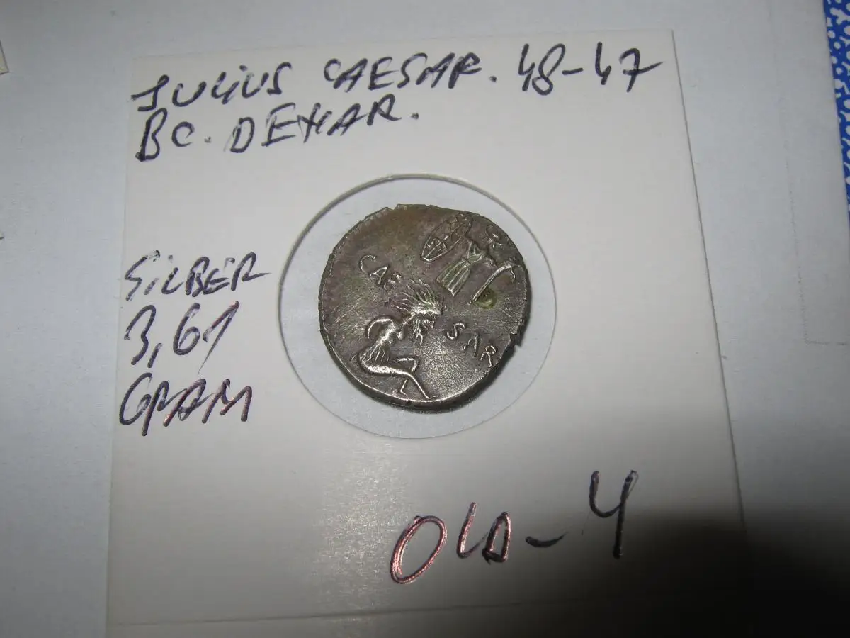 Im Zuge von Caesars Krieg gegen die von Pompeius und später Metellus Scipio geführte senatorische Fraktion getroffen, posaunt Caesars triumphale Prägung seine militärischen Errungenschaften und Eroberungen in Gallien, während sie den Träger auch an seine behauptete Abstammung von der Venus durch Aeneas erinnert. Die unter der Waffentrophäe gebundene Rückseite soll den besiegten Vercingetorix darstellen. Obwohl Crawford und Sear dieser Identifizierung skeptisch gegenüberstehen, wurde oft gesagt, dass die sorgfältig wiedergegebenen Details der Figur, von der markanten Braue und den eingefallenen Augen bis hin zum Drehmoment um seinen Hals, stark an ein individuelles Porträt erinnern. 48/7 v. Chr. schmachtete der besiegte gallische Häuptling noch immer im Tullianum, dem unterirdischen Gefängnis unter dem Comitium. Er würde 46 zu Caesars Triumph herausgeschleppt, dann in seine Zelle zurückgebracht und erwürgt werden.