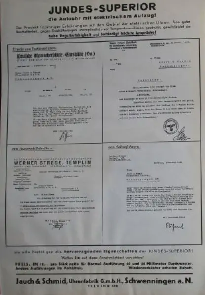 Jundes Autouhren Programm "Genaue Zeit?" 1936 Zubehörprospekt (6380)