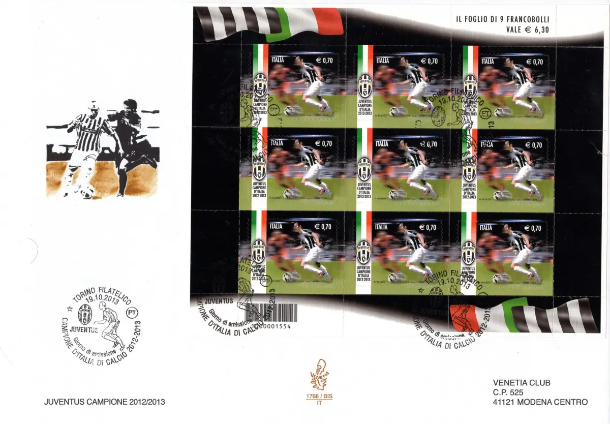 Umschlag - Juventus Italienischer Meister 2013 der neunfache Kleinbogen (Sass. Nr. 30) auf Beutel des Venetia Clubs - perfekt - Seltener EuroN.C Katalog. Cod.2270/WEB