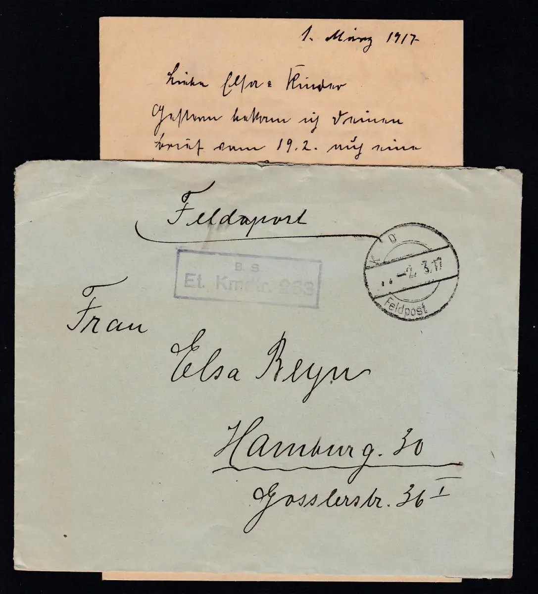 K D Feldpost … 2.3.17 + R2 B.S. Et. Kmdtr. 263 auf Feldpostbrief mit Inhalt,