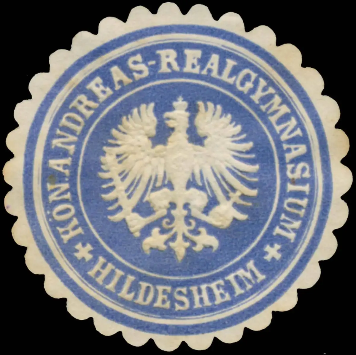 Gymnasium, Schule, blau, weiß, geprägt, Größe/Zustand: 4 , fleckig, Original Verschluss-Siegelmarke aus Papier welche früher von Behörden, Firmen etc. zum Versiegeln der Briefe benutzt wurden