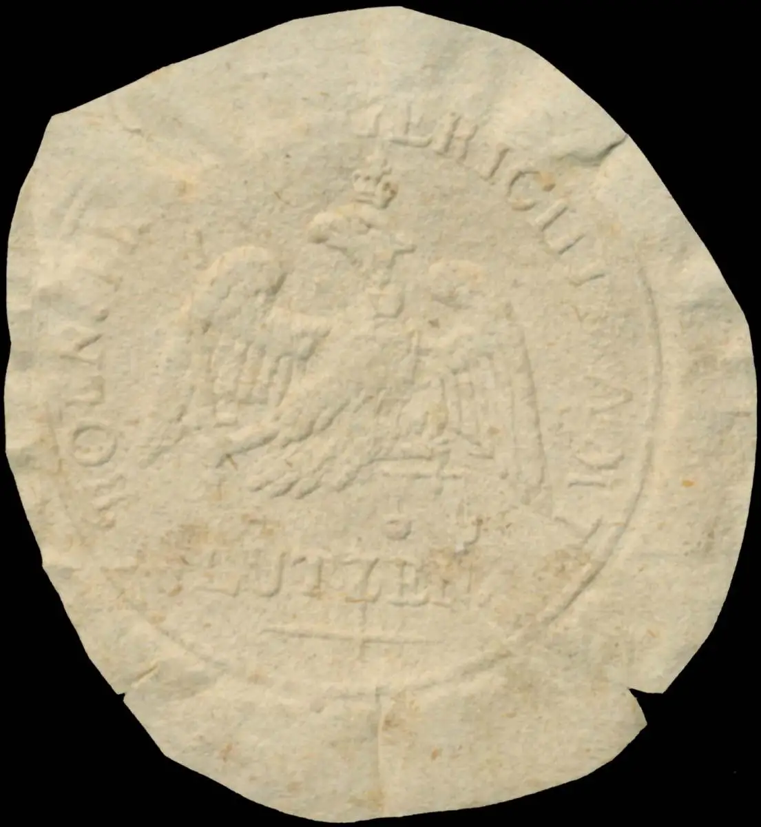 Briefsiegelmarke, weiß, geprägt, Größe/Zustand: 5 , fleckig, Original Verschluss-Siegelmarke aus Papier welche früher von Behörden, Firmen etc. zum Versiegeln der Briefe benutzt wurden