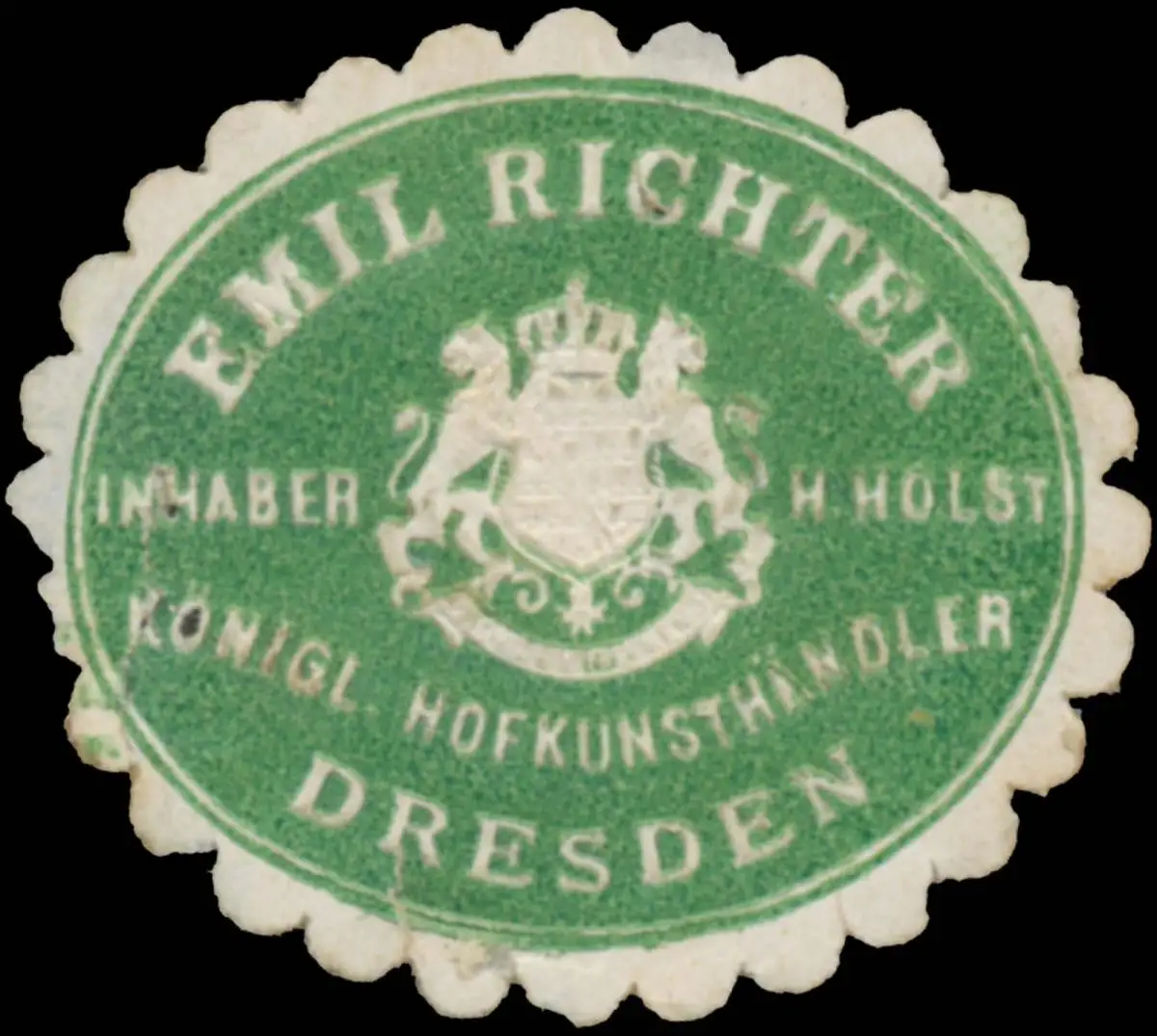 Inhaber: H. Holst, Kunst, grün, weiß, geprägt, Größe/Zustand: 3x4 , beschädigt, Original Verschluss-Siegelmarke aus Papier welche früher von Behörden, Firmen etc. zum Versiegeln der Briefe benutzt wurden