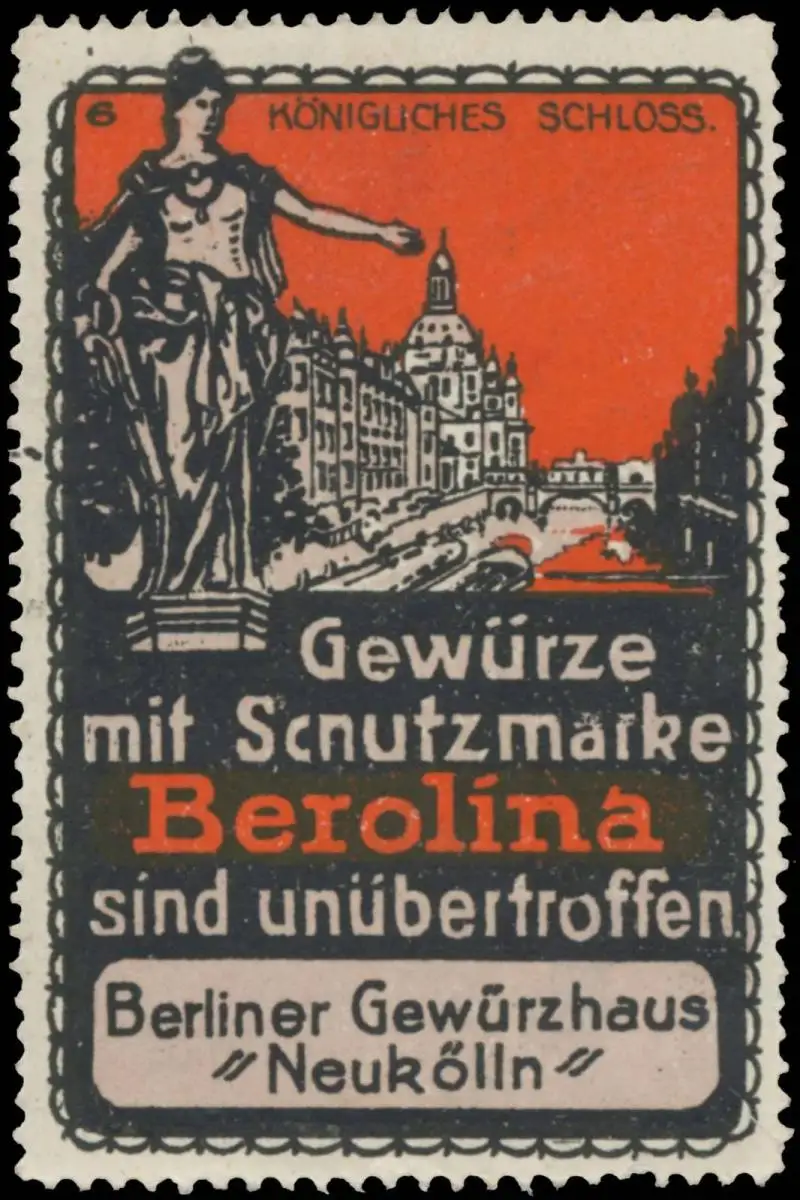 Gewürze mit Schutzmarke Berolina, Bild 6, Neukölln, Größe/Zustand: 6x4 , guter Zustand, Original alte Reklamemarke die seinerzeit für die Werbung benutzt wurde
