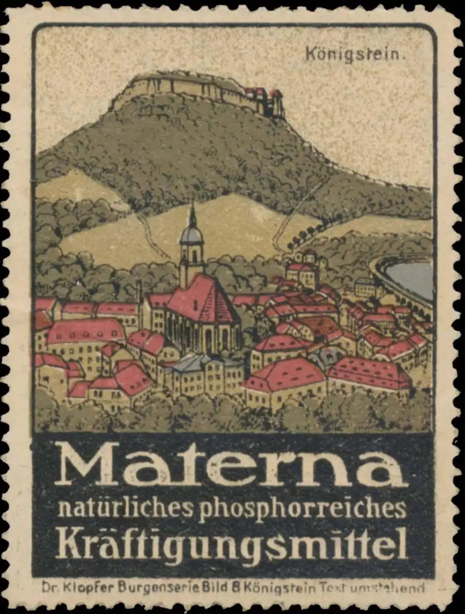 Materna natürliches phosphorreiches Kräftigungsmittel, Burgenserie Bild 8, Größe/Zustand: 6x4 , guter Zustand, Original alte Reklamemarke die seinerzeit für die Werbung benutzt wurde
