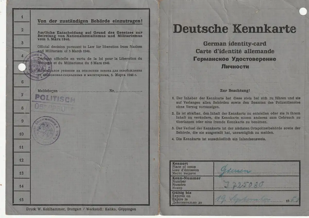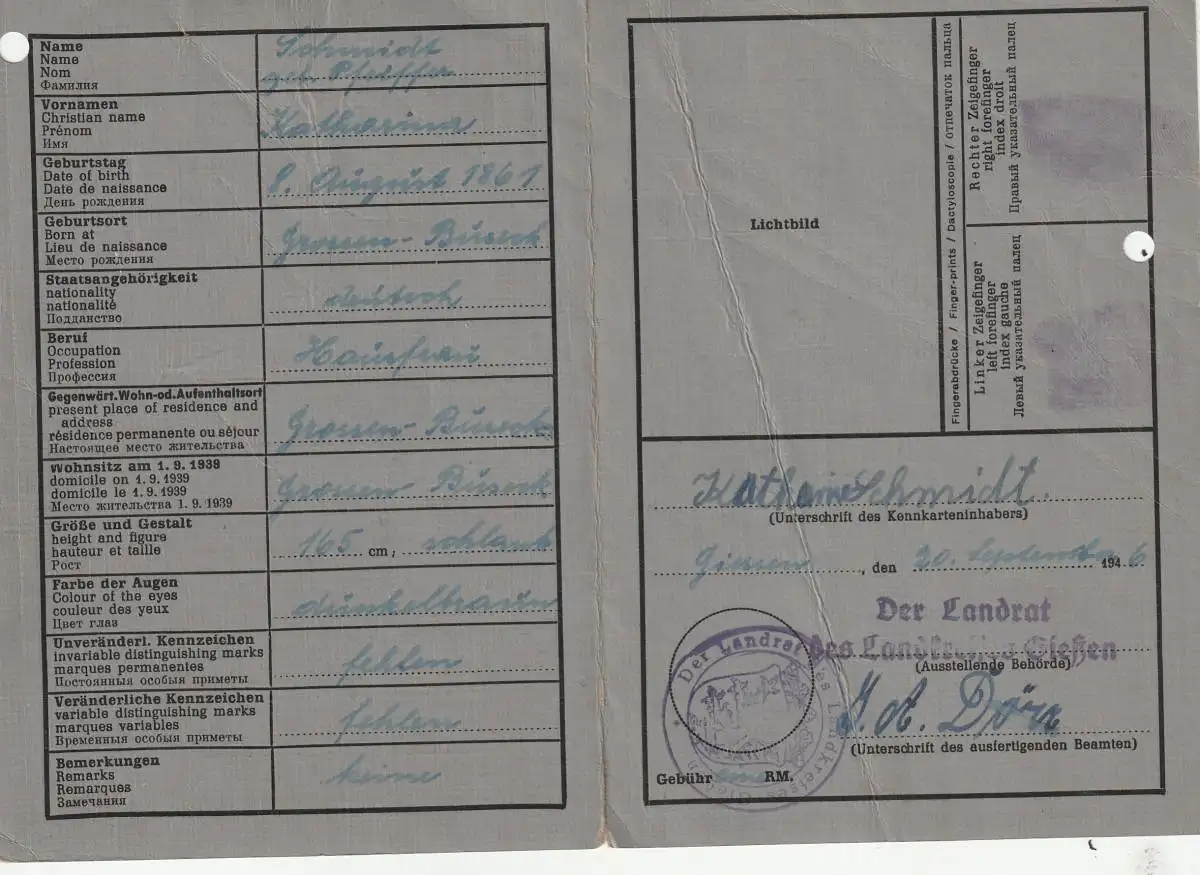 DEUTSCHE KENNKARTE / PERSONALAUSWEIS, Giessen 1946, Politisch überprüft !!!