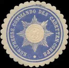 Cadetten-Corps, Kadettenanstalt, blau, weiß, geprägt, Größe/Zustand: 4 , guter Zustand, Original Verschluss-Siegelmarke aus Papier welche früher von Behörden, Firmen etc. zum Versiegeln der Briefe benutzt wurden