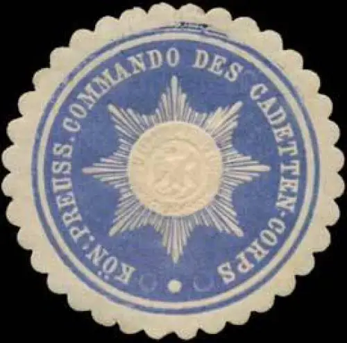 Cadetten-Corps, blau, weiß, geprägt, Kadettenanstalt, Größe/Zustand: 4 , guter Zustand, Original Verschluss-Siegelmarke aus Papier welche früher von Behörden, Firmen etc. zum Versiegeln der Briefe benutzt wurden