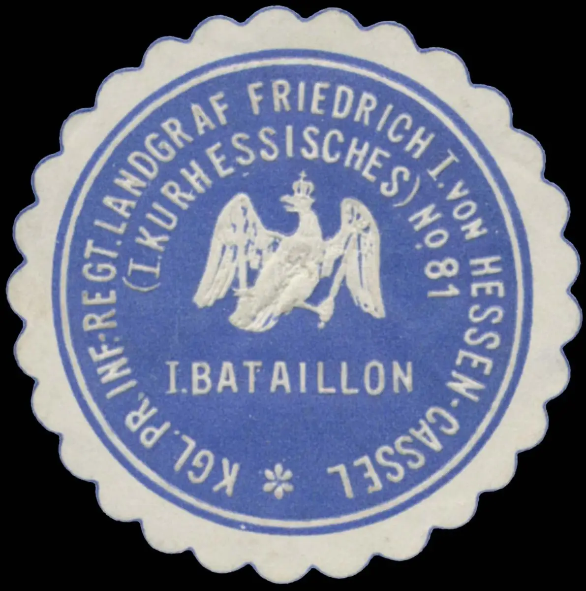 I. Kurhessisches No. 81, I Bataillon, Militär, blau, weiß, geprägt, Größe/Zustand: 4 , guter Zustand, Original Verschluss-Siegelmarke aus Papier welche früher von Behörden, Firmen etc. zum Versiegeln der Briefe benutzt wurden