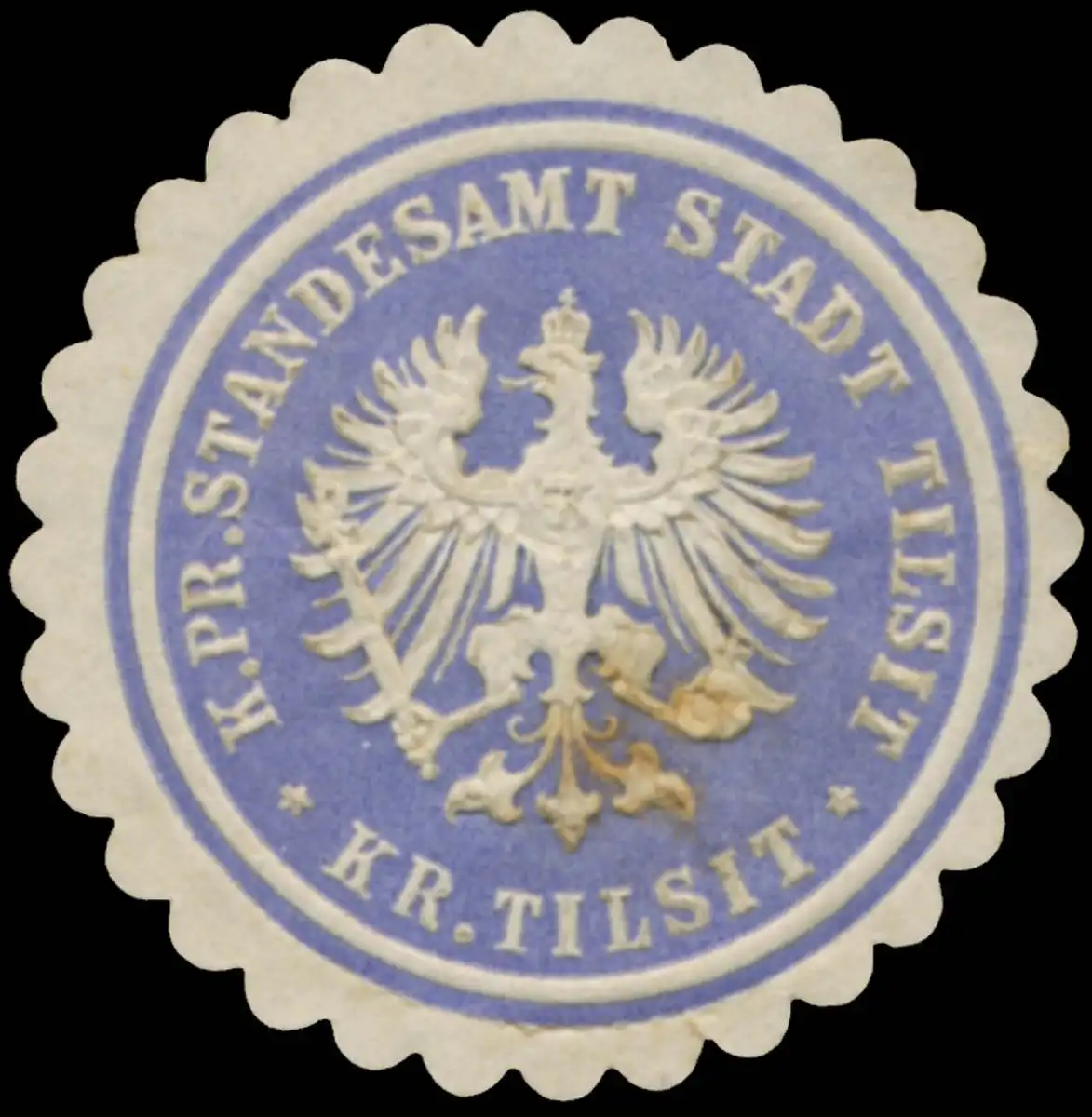 Kreis Tilsit, blau, weiß, geprägt, Größe/Zustand: 3 , beschädigt, Original Verschluss-Siegelmarke aus Papier welche früher von Behörden, Firmen etc. zum Versiegeln der Briefe benutzt wurden