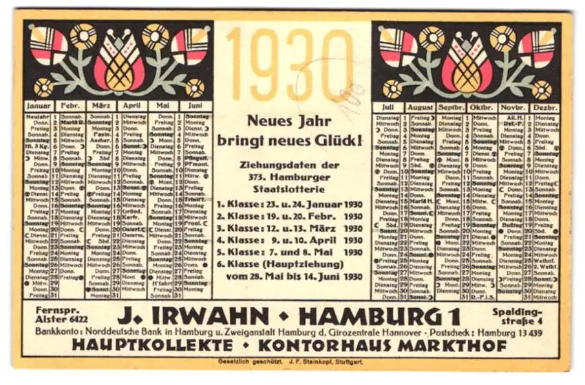 Kalender 1930, J. Irwahn, Hamburg, Blumenverzierung
