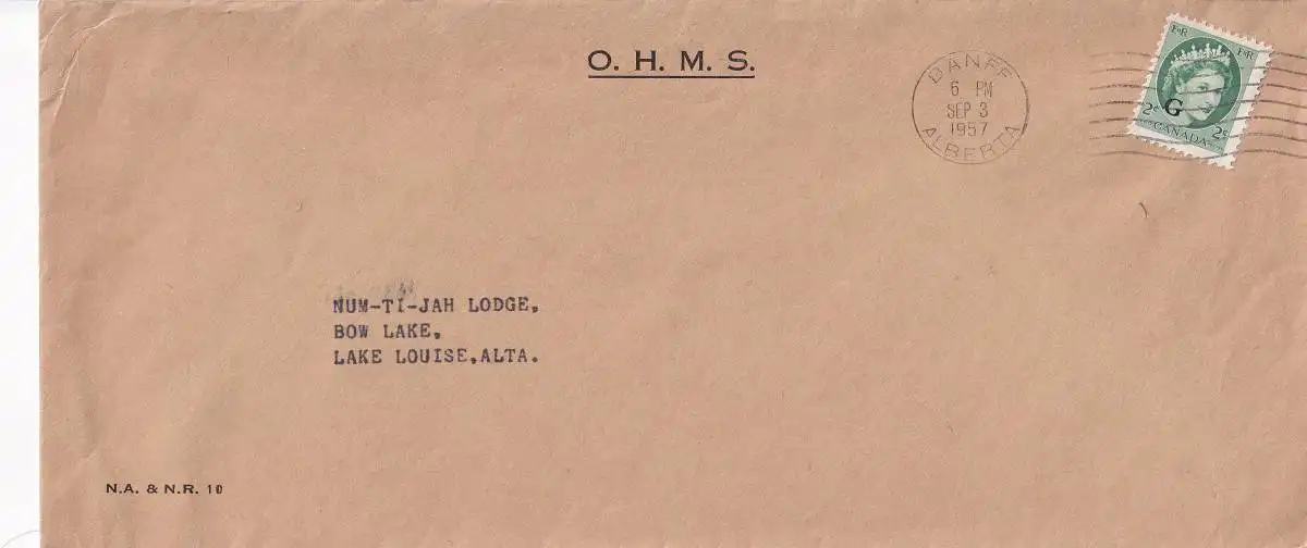 KANADA 1957 QEII DIENSTMARKE 2c BRIEF BANFF nach LAKE LOUISE