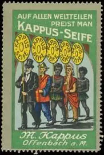 auf allen Weltteilen preist man Kappus-Seife, Kosmetik, Waschmittel, Größe/Zustand: 6x4 , guter Zustand, Original alte Reklamemarke die seinerzeit für die Werbung benutzt wurde