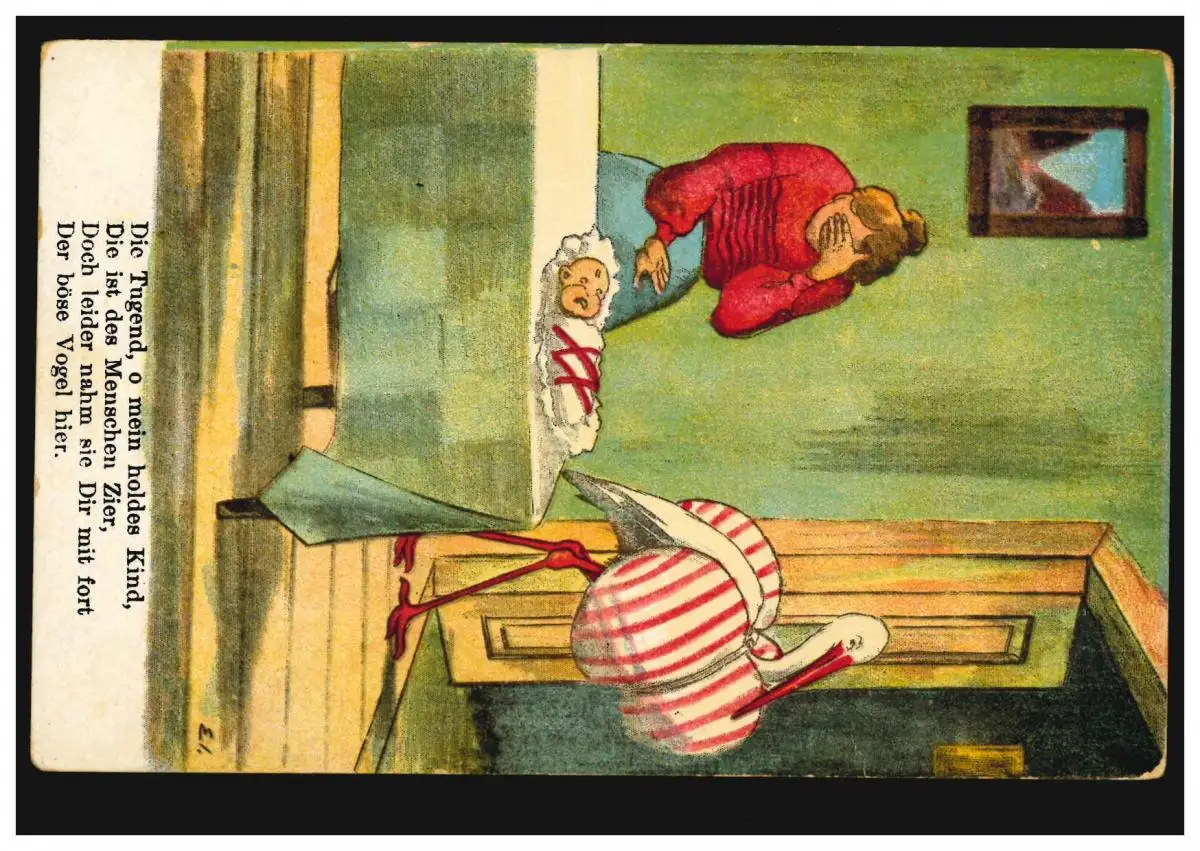 Karikatur-AK Gedicht Der böse Vogel hier: Storch bringt Säugling, ungebraucht