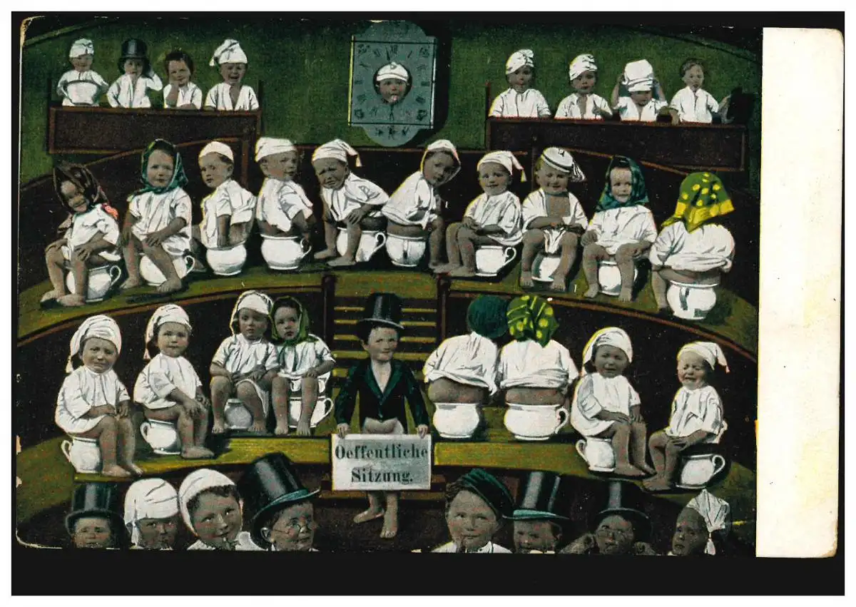 Karikatur-AK Öffentliche Sitzung: Kinder auf ihrem Nachttopf, ungebraucht