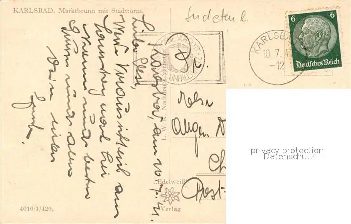 Karlsbad_Eger Marktbrunnen mit Stadtturm Karlsbad_Eger postalisch gelaufen 1941 Erhaltung siehe scans [FriedD77] Frierer