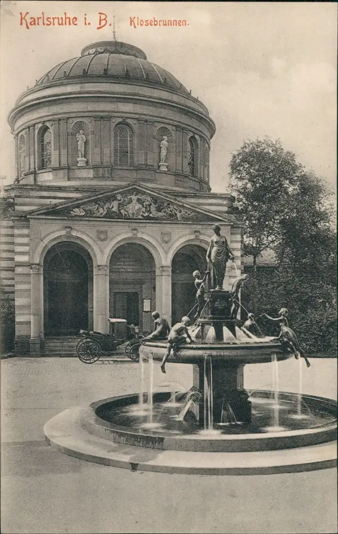 Karlsruhe Klosebrunnen, dahinter Kuppelgebäude u. Auto-Droschke 1910