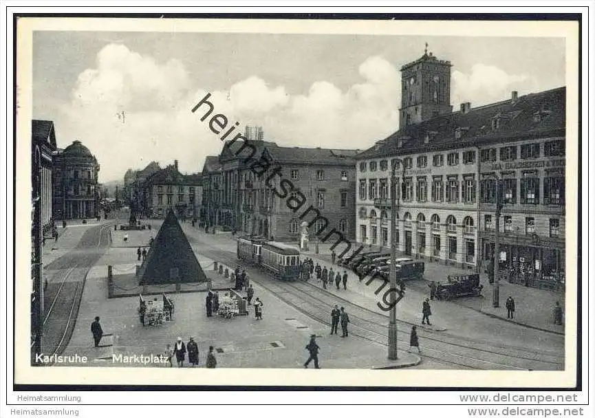 Karlsruhe - Marktplatz - Strassenbahn - Sparkasse - Verlag W. M. L. - leichte Gebrauchsspuren (E41073) gel. 1935