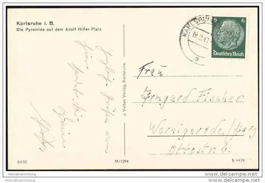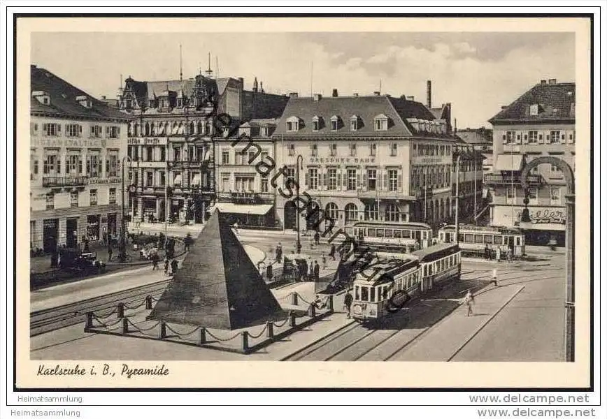 Karlsruhe - Pyramide auf dem Adolf Hitler Platz - Strassenbahn - Verlag J. Velten Karlsruhe (E41074) gel. 1941