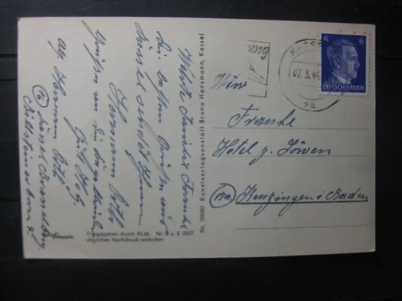 ca. 1944; Unschärfen, Spiegelungen, Verbiegungen sind allein durch das abfotografieren bedingt; Karte ist beidseitig abgebildet, Erhalt siehe Scan; ist das Foto qualitativ nicht aussagekräftig genug, kann es besseres Foto angefordert werden. Rückgabe bei Karten ist generell ausgeschlossen.