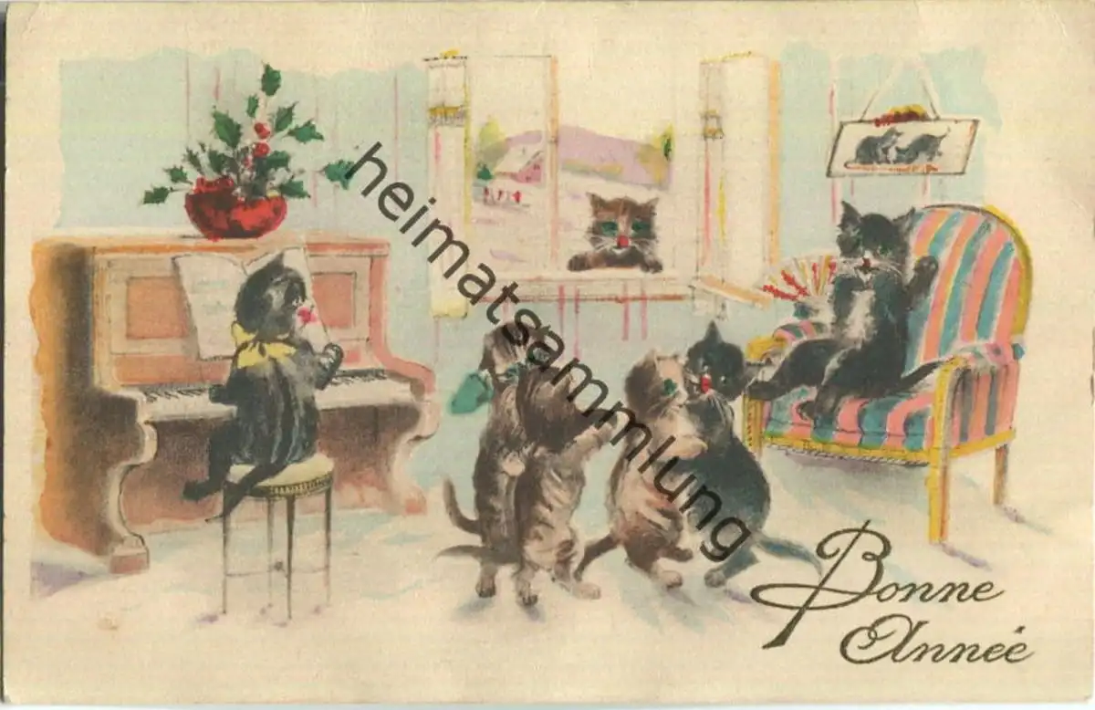 Katzenkonzert - 'Bonne Année' - Rückseite beschrieben - leichte Gebrauchsspuren (G14196) *