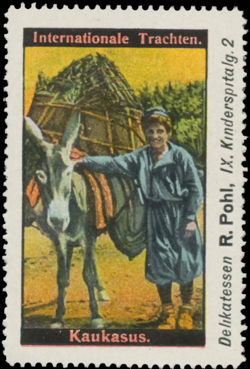 Serie Internationale Trachten, Delikatessen R. Pohl, Kinderspitalgasse 2 , Größe/Zustand: 6x4 , leicht beschädigt, Original alte Reklamemarke die seinerzeit für die Werbung benutzt wurde